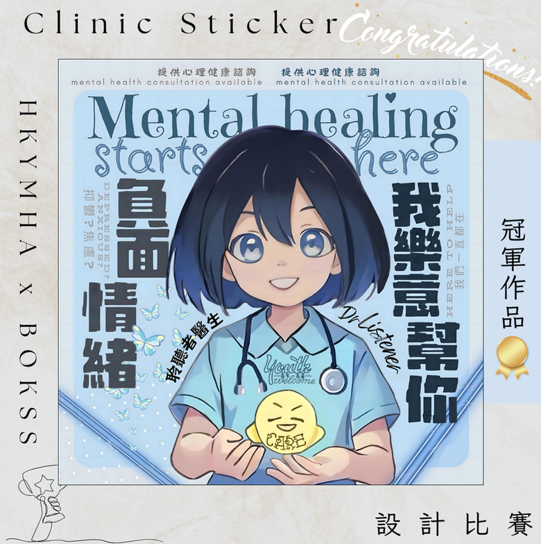 呢個clinic sticker 以開心嘅人同唔開心嘅人相擁作為主體,形成了"M"嘅形狀,代表「mental health」嘅首字母。下面嘅文字寫著「情緒 OK here to listen」,畀佢哋知道診所呢度接受有關情緒嘅問題,並準備聆聽並接納佢地嘅任何煩惱,仲傳達咗更深層嘅信息:有情緒係件正常嘅事 ,唔洗對此感到羞愧可恥。